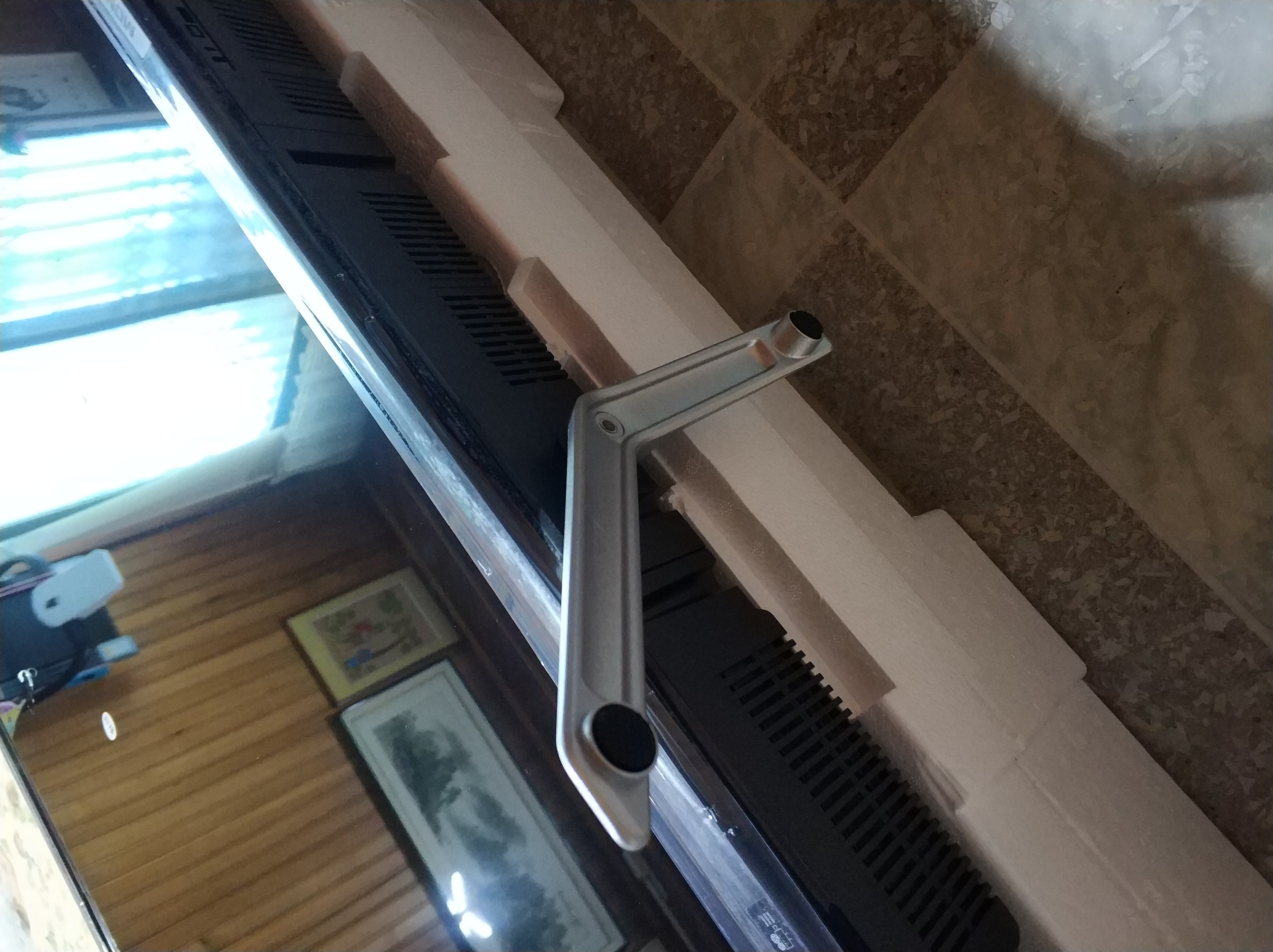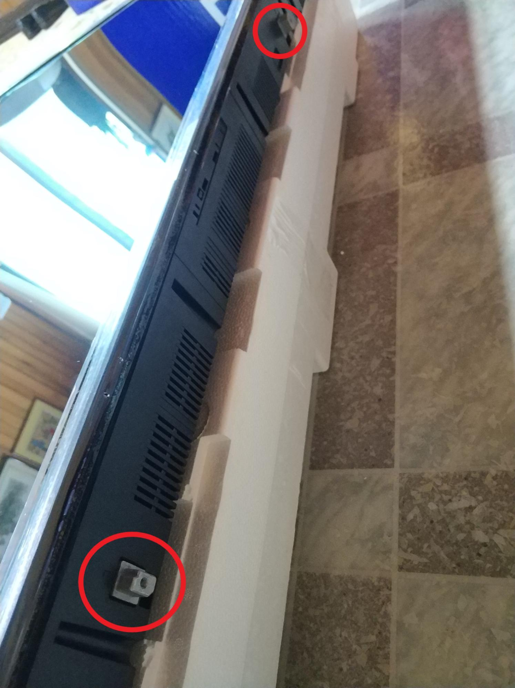 그런데 맨바닥에다가 덩그러니 TV를 놓고 다리 설치 등을 작업하려고 하니, 높낮이도 그렇고 파손 위험이 있을 것 같아서 아까 전에 빼놓았던 스티로폼 케이스를 바닥에 깔고, 그 위에 TV를 올려놓고 작업을 했습니다.