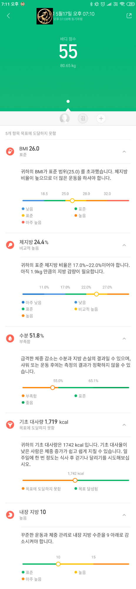 측정되는 값은 위 스크린샷 참고하시면 됩니다. ( 살이 많이 찌긴 쪘네요.... 몇 달전에 비해 10kg이나 쪄버렸으니 ㅠ)