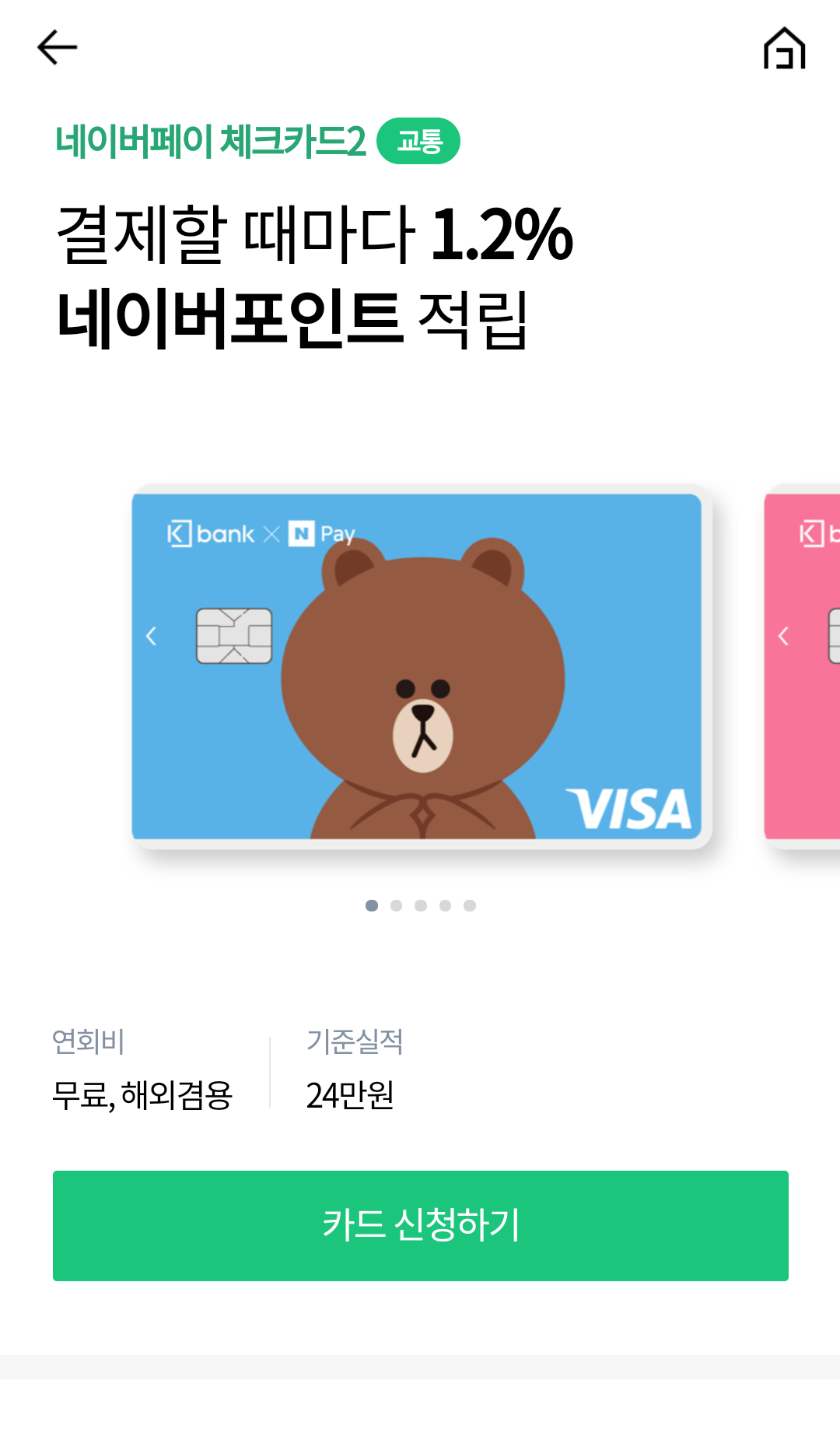 4. 케이뱅크x네이버페이 체크카드 : 신한 네이버페이 체크카드(1.0% 적립) 대비 높은 포인트 적립율(1.2% 적립)
