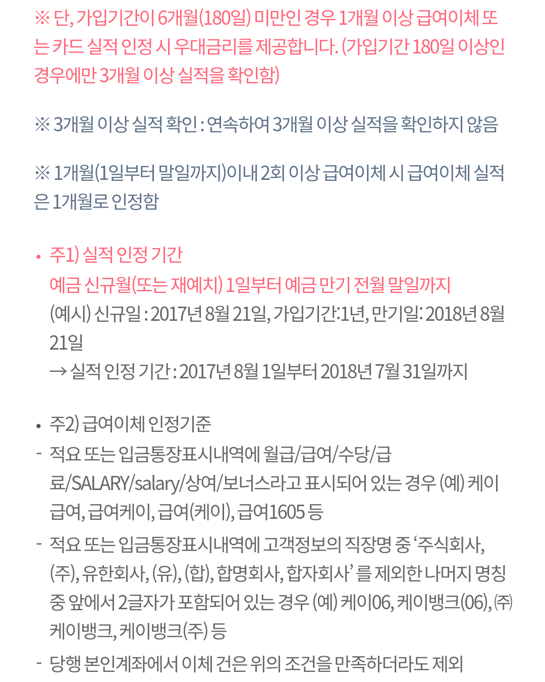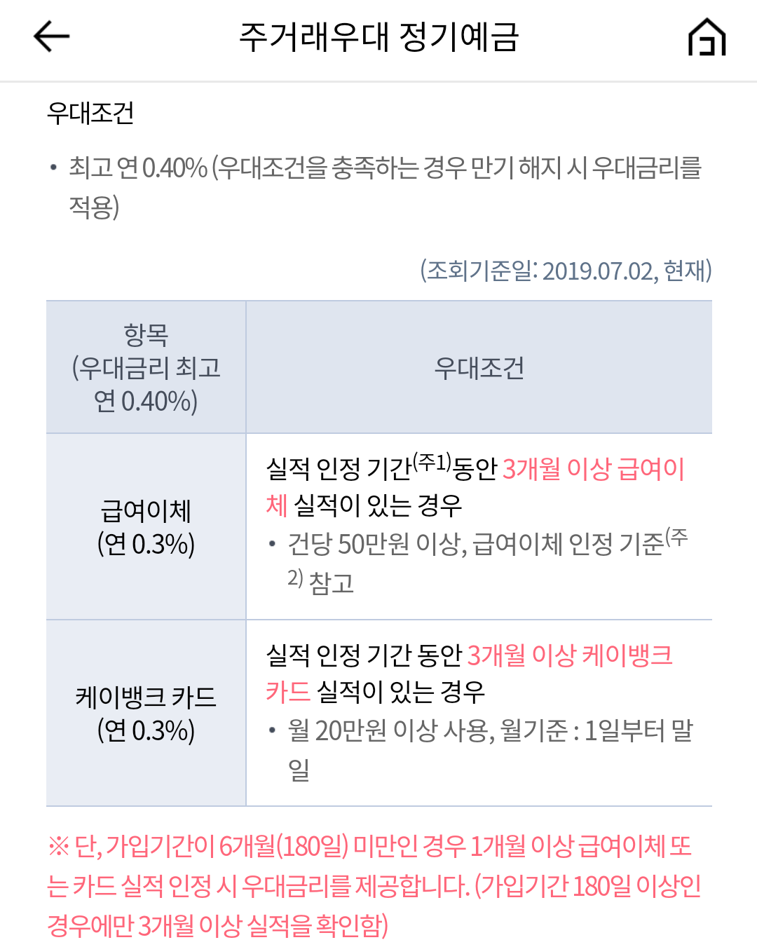 3) 급여이체나 카드 이용실적은 총 가입기간 중 3개월만 충족하면 우대금리 적용 가능.
