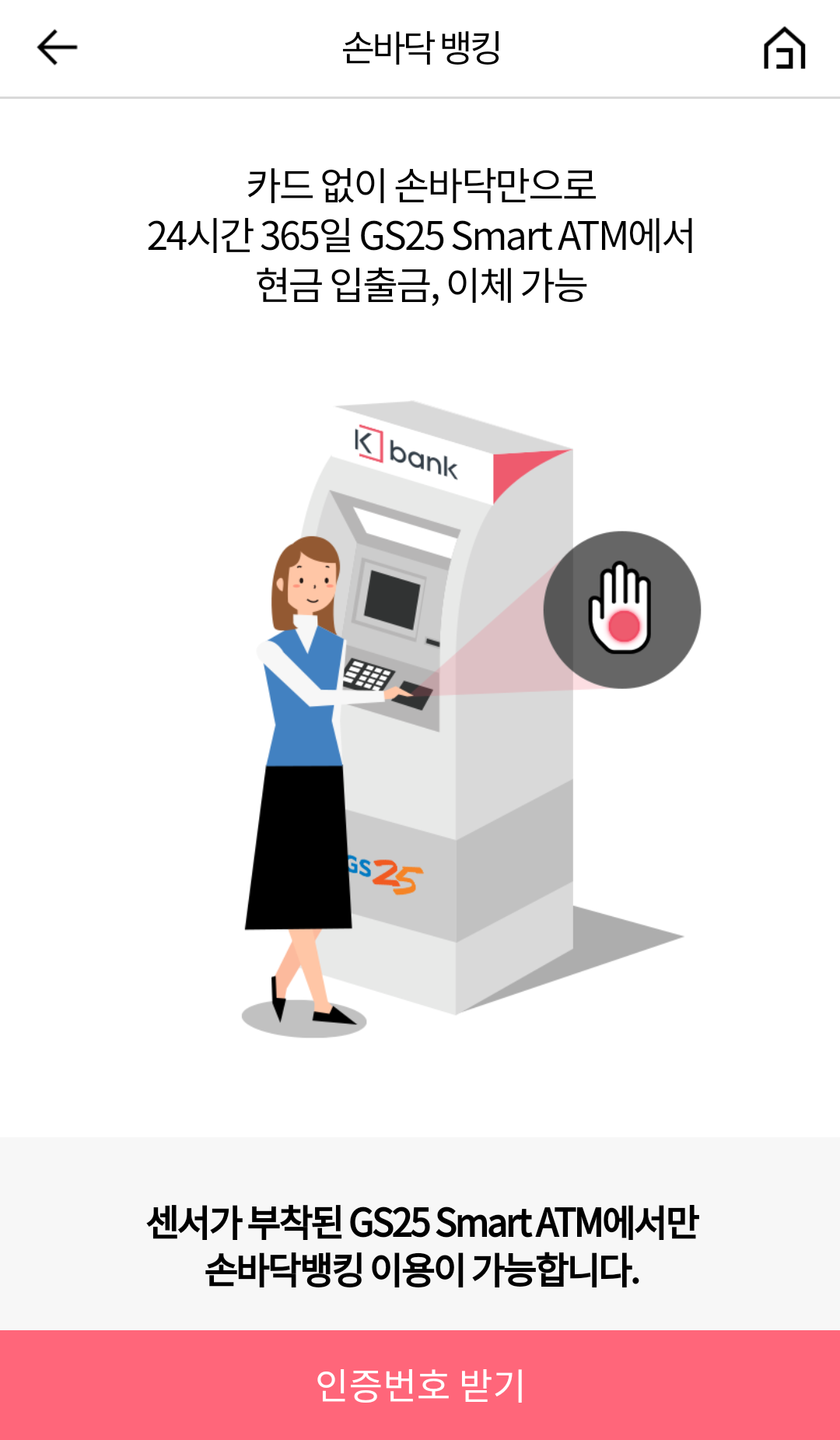 1) 손바닥 뱅킹 등록 시, 케이뱅크 카드가 없더라도 GS25 ATM 기기에서 손바닥 인식을 통해 현금 입출금 가능.
