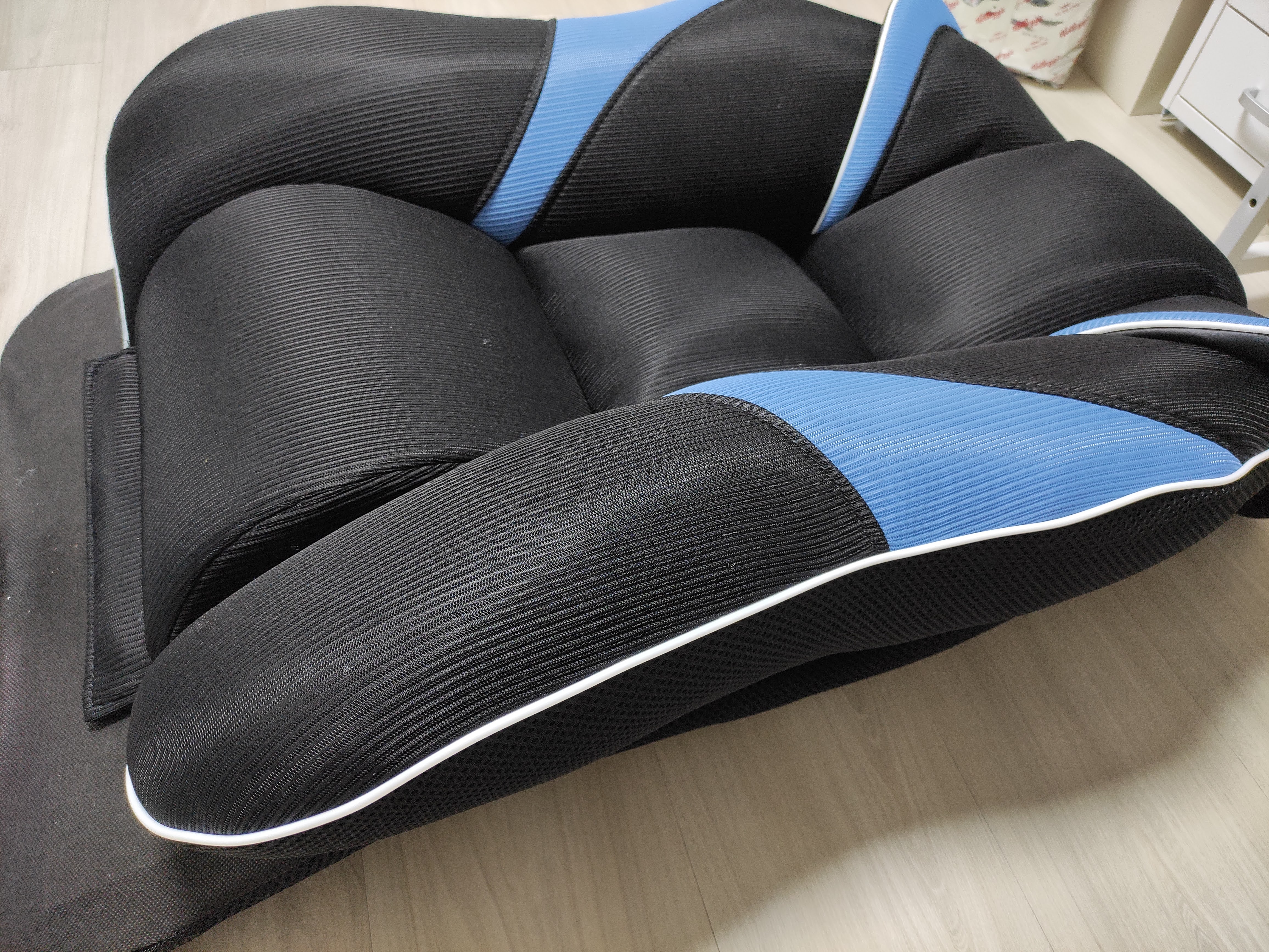 그런데 실제로 앉아보면은 중앙부는 거의 등에 접촉하지 않는 듯한 느낌입니다. 닿더라도 아주 살짝 닿고, 주로 하단부가 가장 많이 접촉하게 되네요. 완전히 120도 가까이로 누웠을 때 포근하게 받쳐주기 시작하는 것 같습니다.