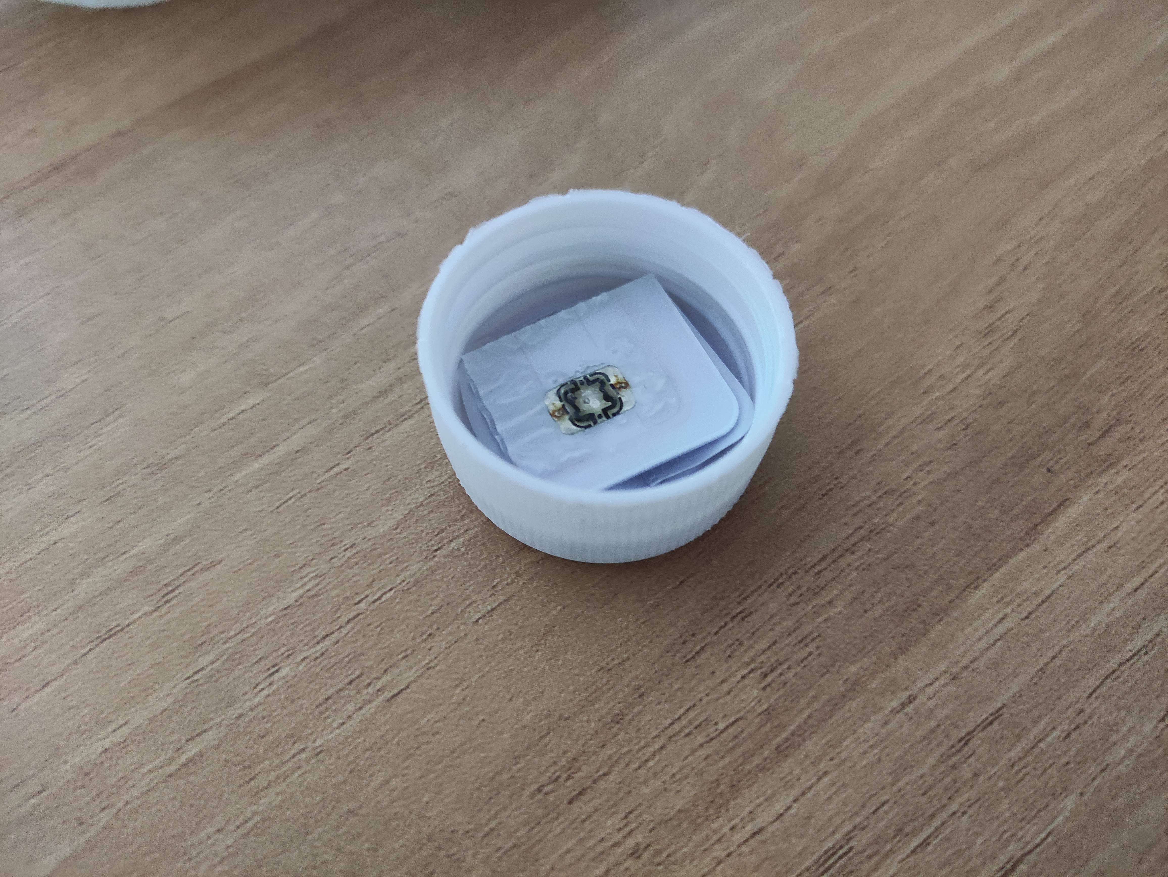 3. 양면테이프 위에 딱풀 뚜껑을 붙이고, 구매한 에나멜 선(두께 0.3 mm)을 뚜껑 주변으로 1회 감습니다.