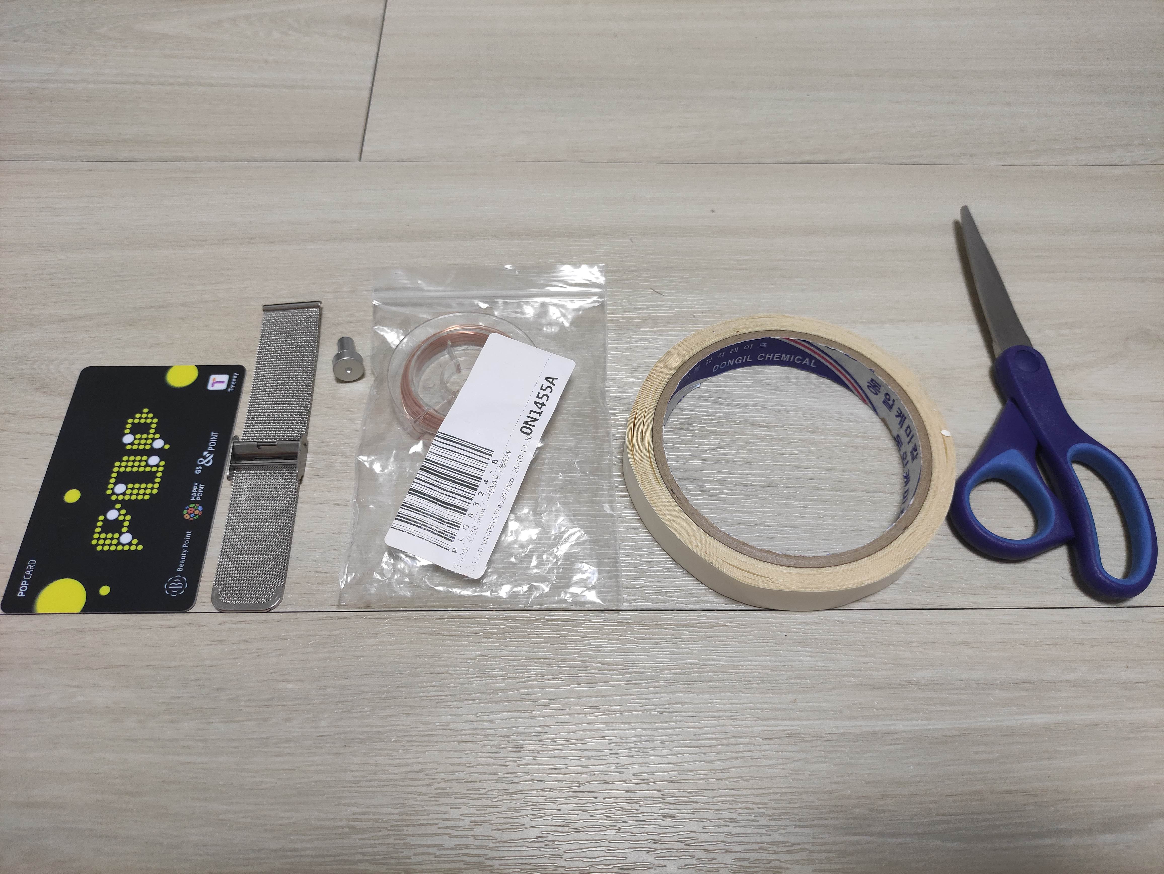 1. 플라스틱 카드 및 양면테이프, 일반 작은 스카치테이프, 직경 15 mm 정도의 딱풀 뚜껑 같은 것을 준비합니다.