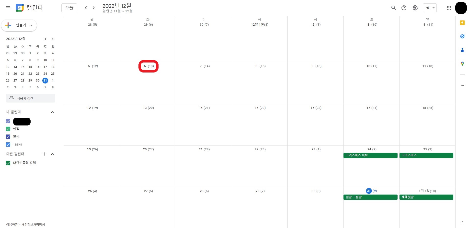 저는 (음력)12월 6일로 설정을 했더니, (양력)2022년 12월 28일에 알림이 설정됐고, 그 다음은 (양력)2024년 1월 16일로 알림이 설정되었습니다. 그 다음해도 보시면 이렇게 음력 날짜 기준으로 반복 알림이 잘 설정된 것을 확인하실 수 있으실거에요!