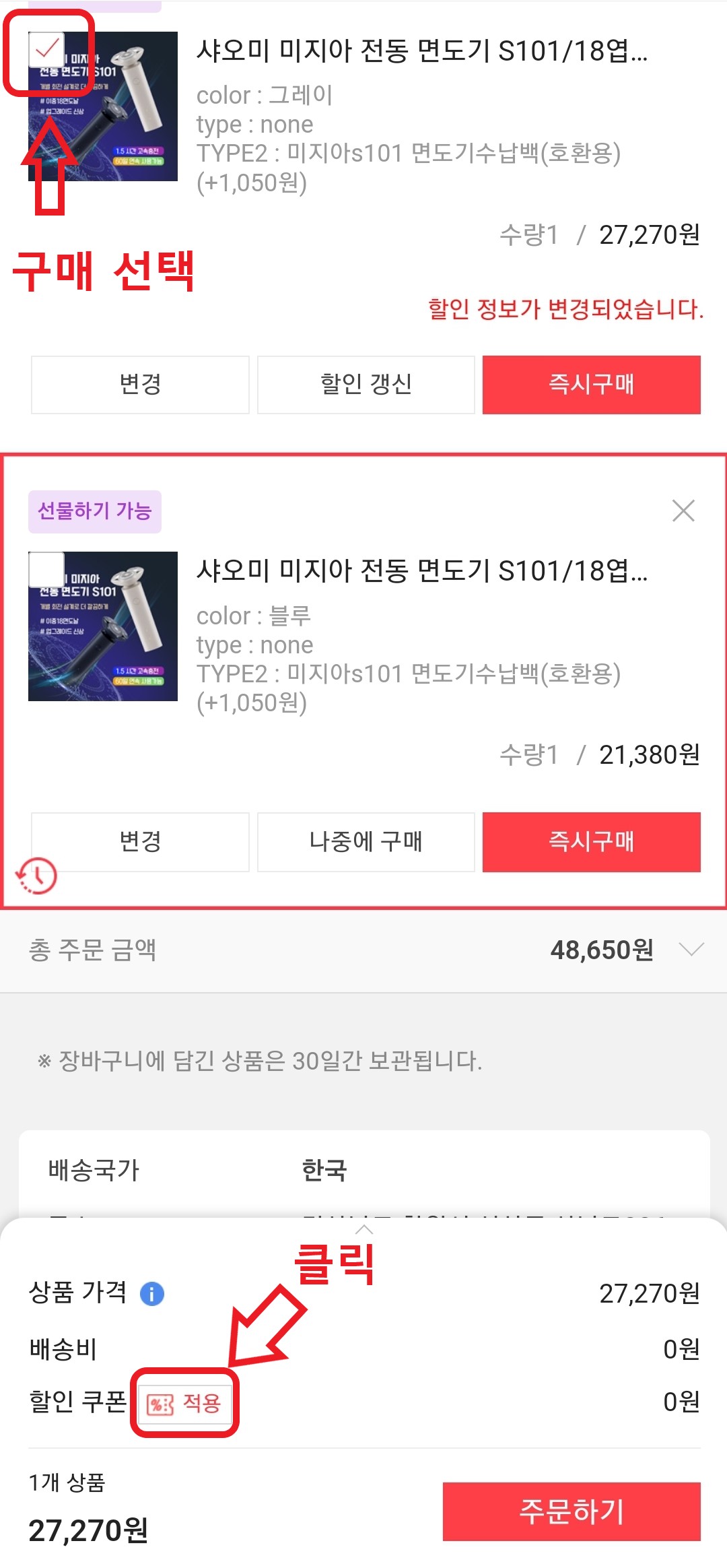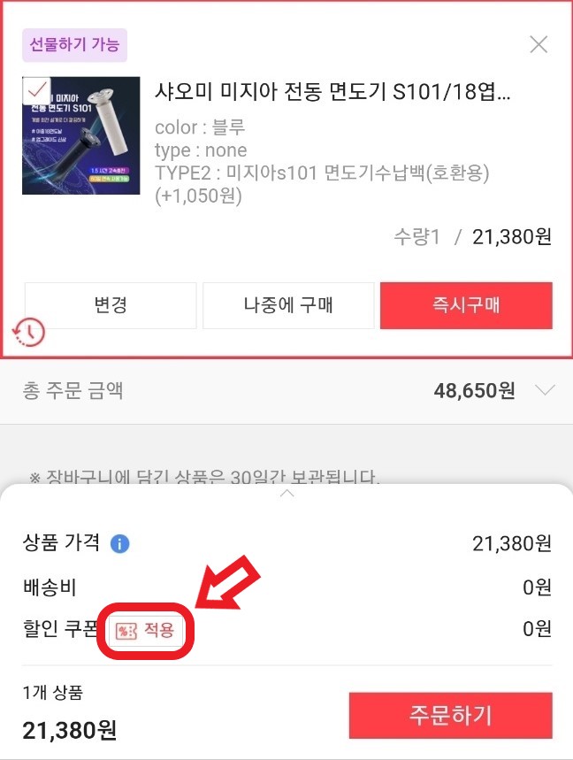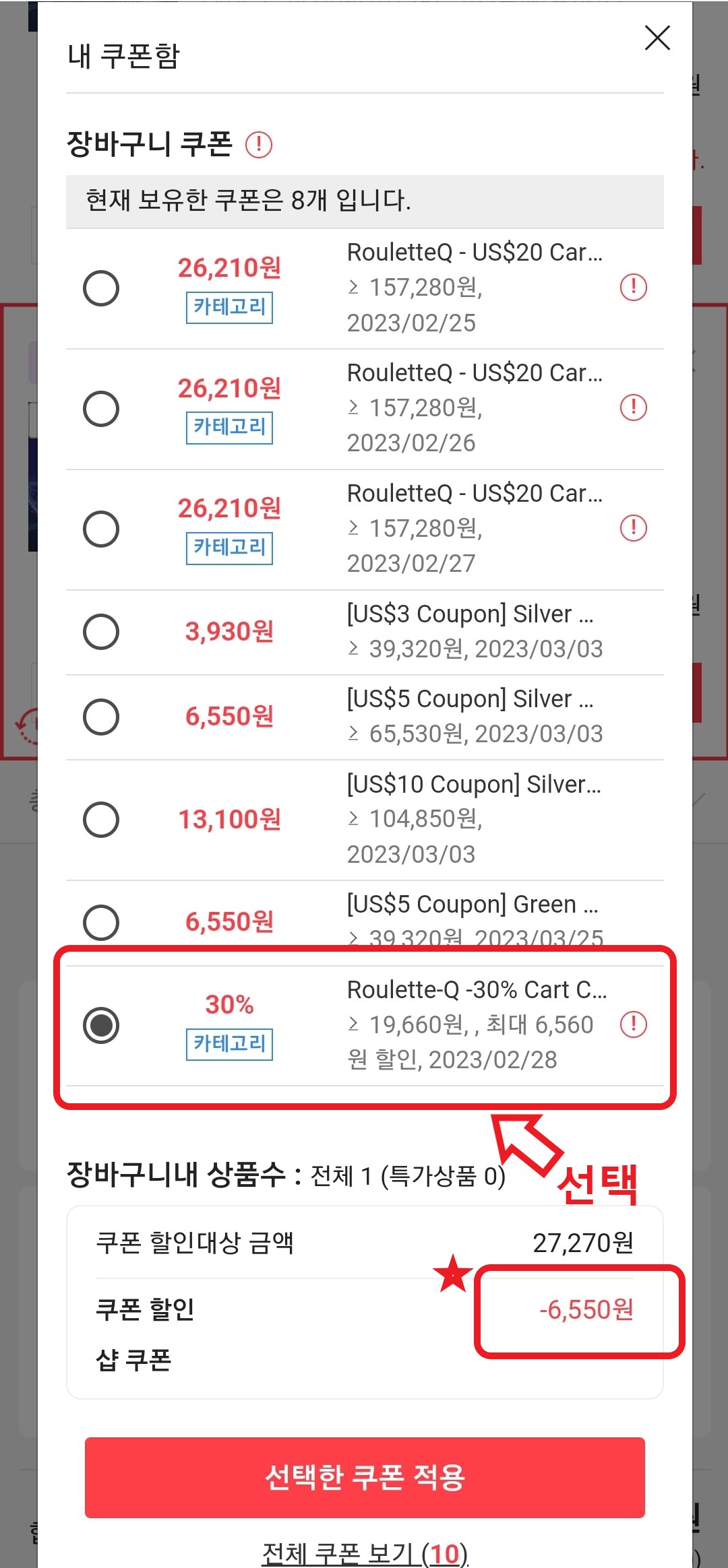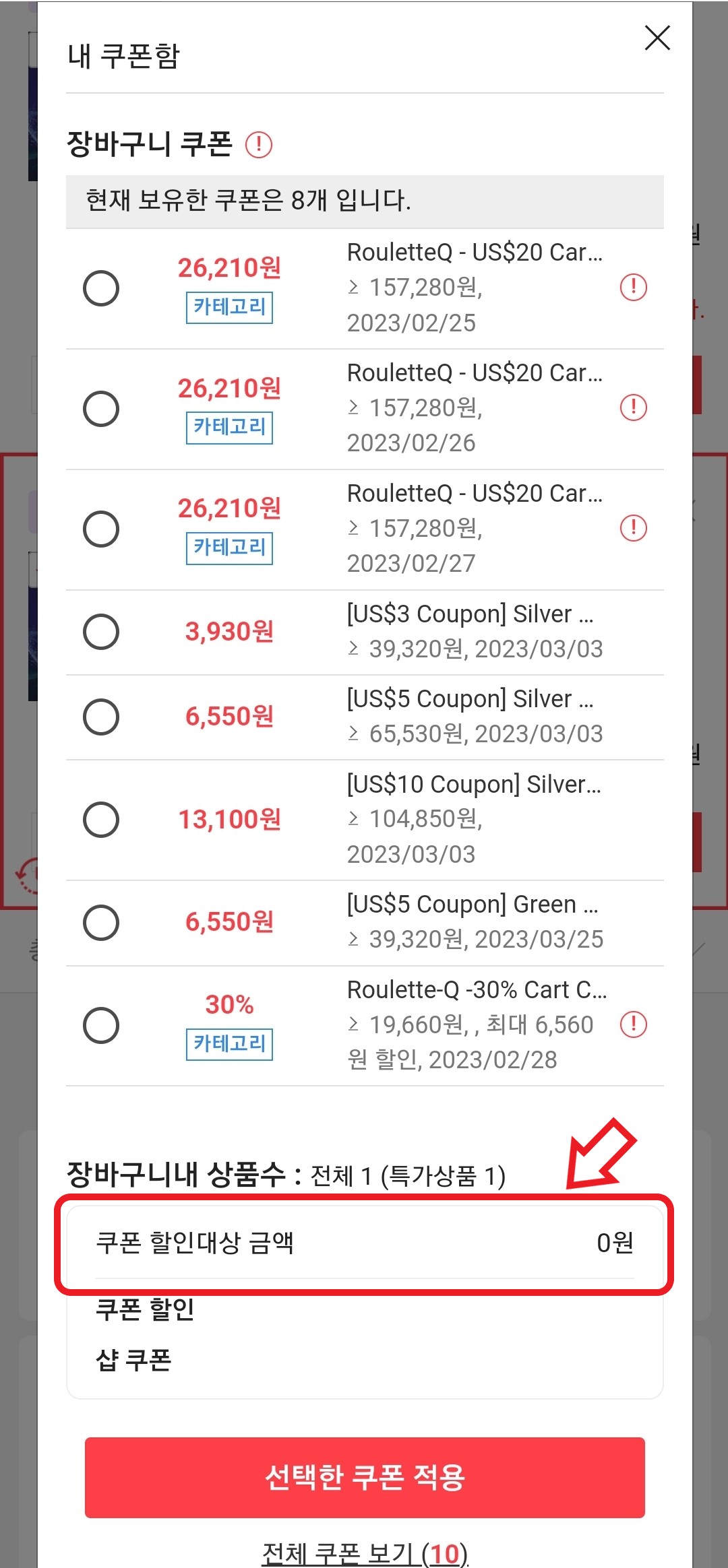 ※ 참고로 쿠폰을 적용시키는 것은 아무 때나 가능한건 아닙니다.