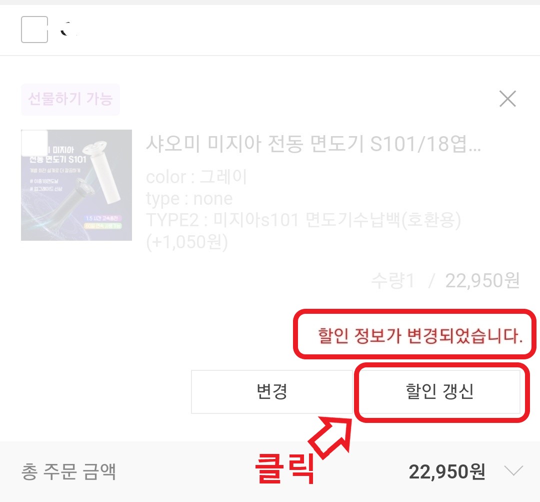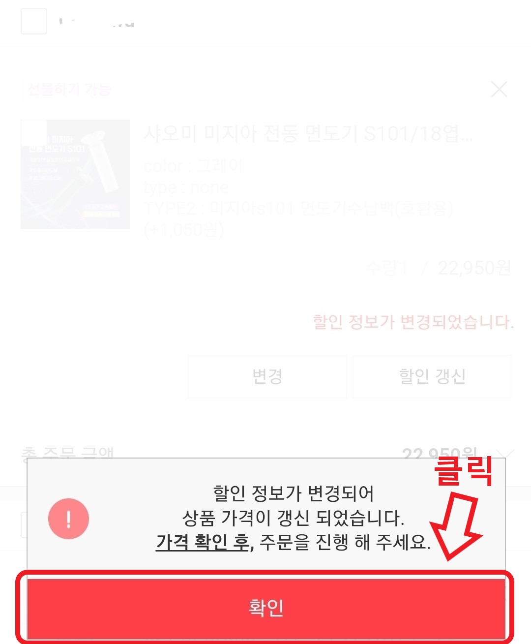 어느 날에 보면 위 스크린샷과 같이 "할인 정보가 변경되었습니다."라고 하며 반투명 처리가 되는 때가 있습니다.