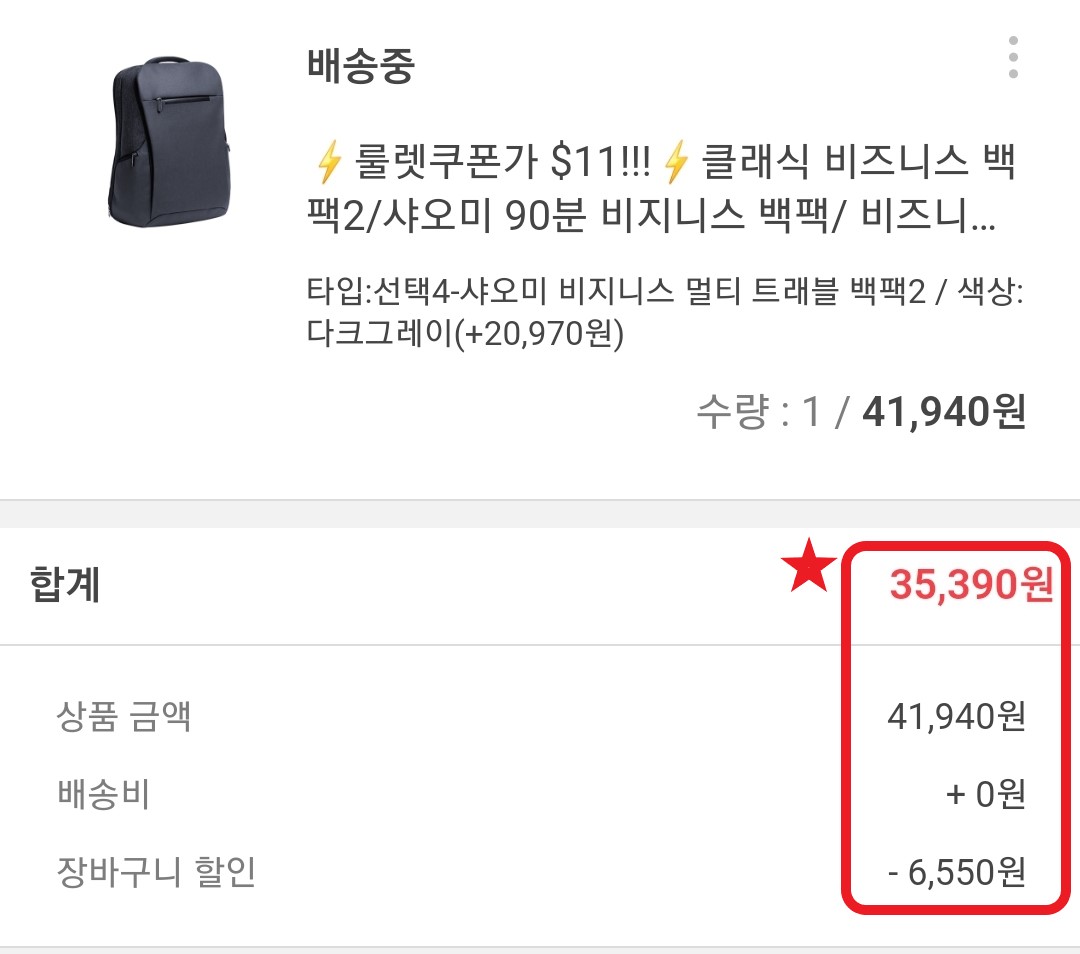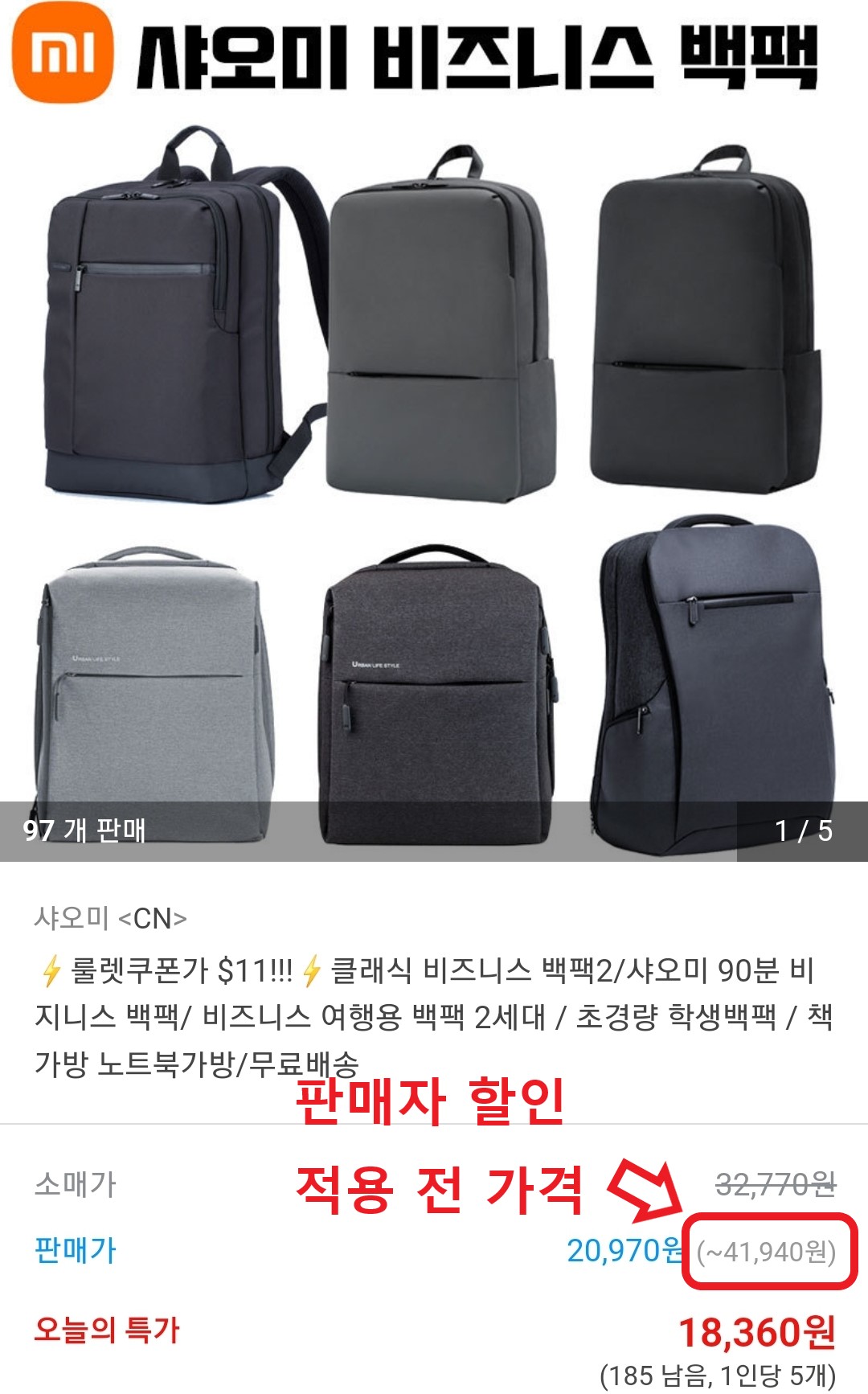 위 샤오미 비즈니스 여행 백팩 2세대의 경우는 해당 판매자가 판매 중인 상품들 중에서 추가 옵션가가 제일 높았기 때문에 판매가 우측에 있는 41,940원이 기준 가격이었습니다.