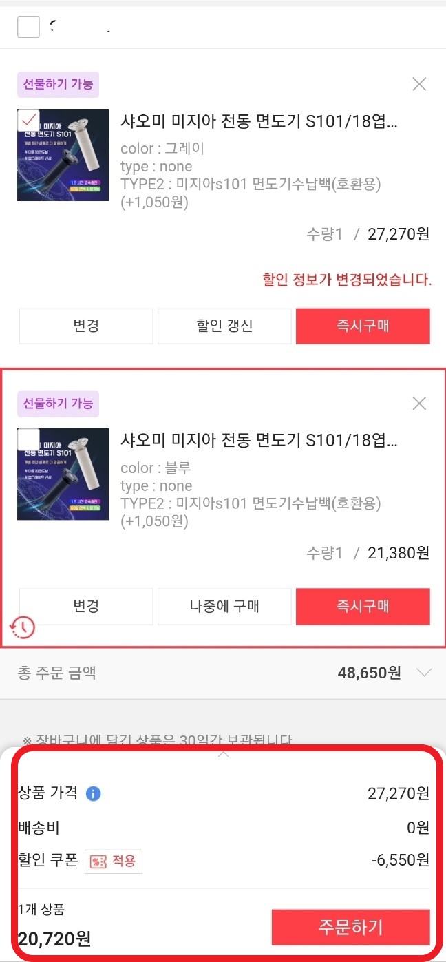 참 그리고 간혹 가다보면 "할인 정보가 변경되었습니다"라고 자주 뜨는 상품이 있더군요.