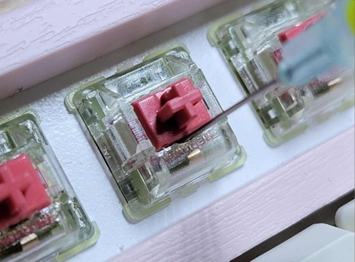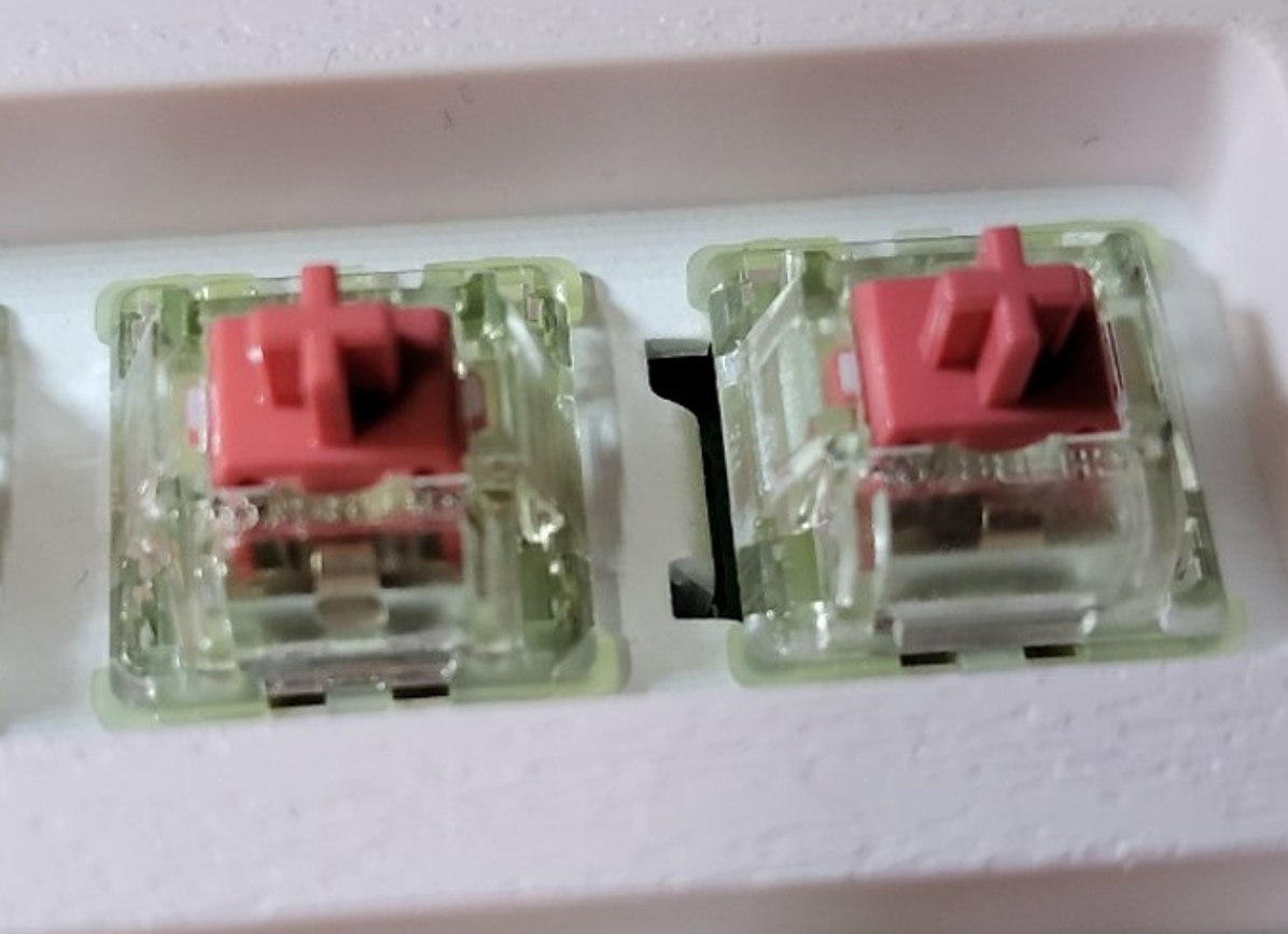 왼쪽 스위치를 보면 "+" 축 주변으로 윤활액이 묻어 있고, 스위치 내부 벽면이 약간 더 투명해진걸 확인할 수 있습니다.