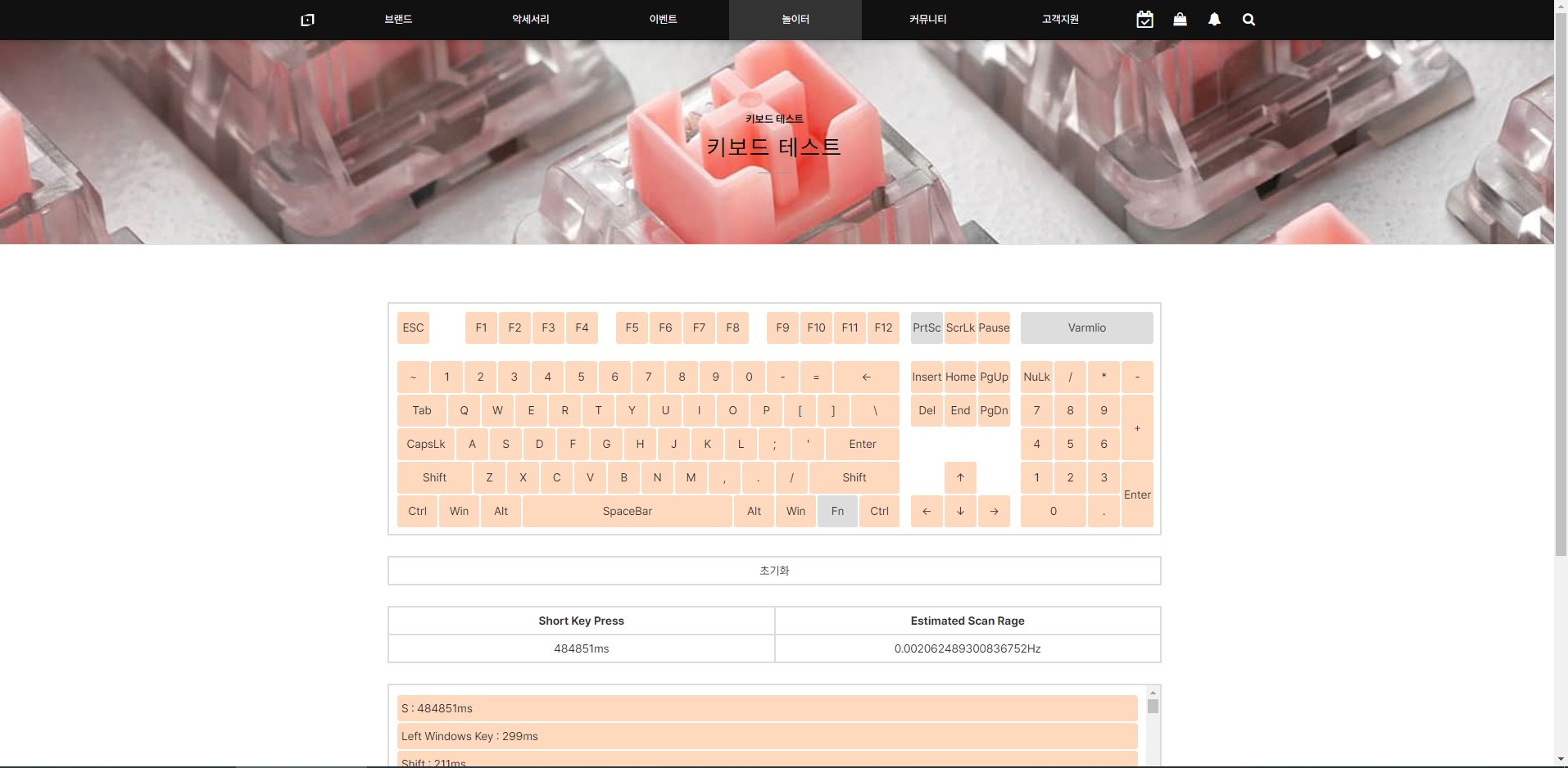 키보드를 연결하고 이 화면을 보면서 모든 키 스위치가 문제없이 작동하는지 확인하시는게 좋습니다.