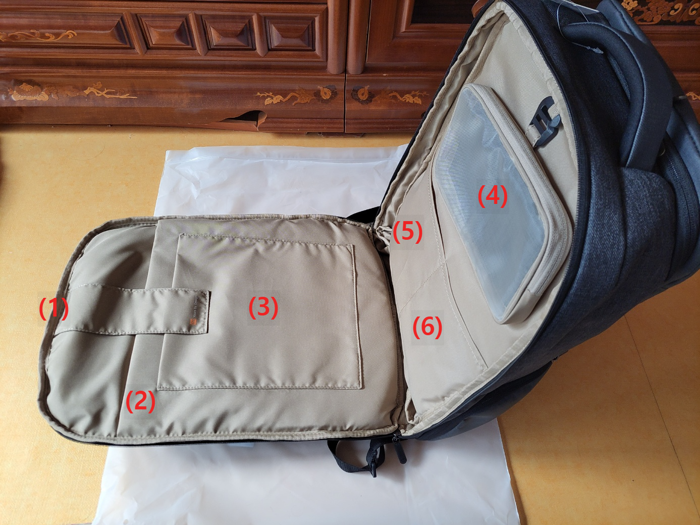 우선 후면 수납공간을 열어보니 위 사진과 같이 지퍼가 바닥부분까지 있어서 180도 오픈이 가능하다는 특징이 있더군요.