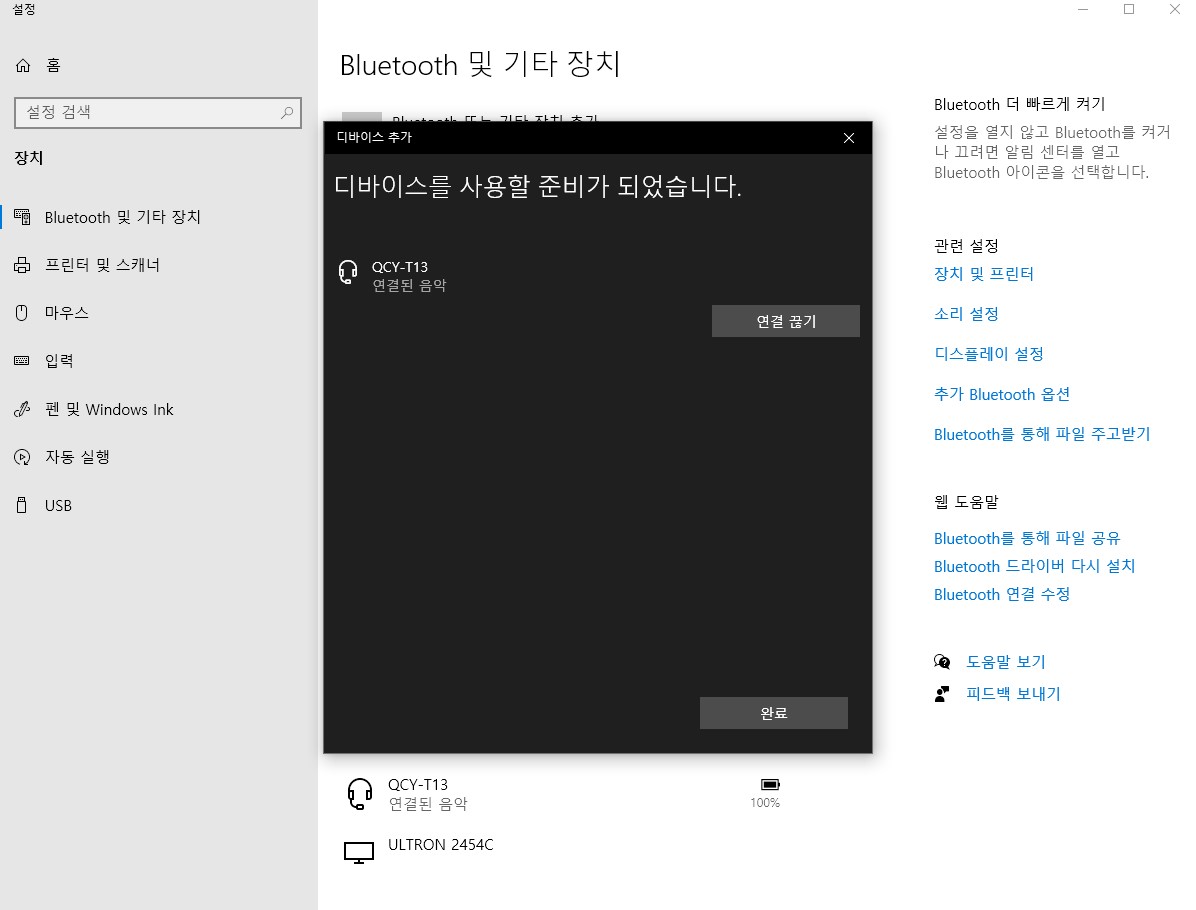 그 후에는 일반 노트북 블루투스 기능 쓰는 것처럼 똑같이 표시되고, 똑같이 사용할 수 있었어요.