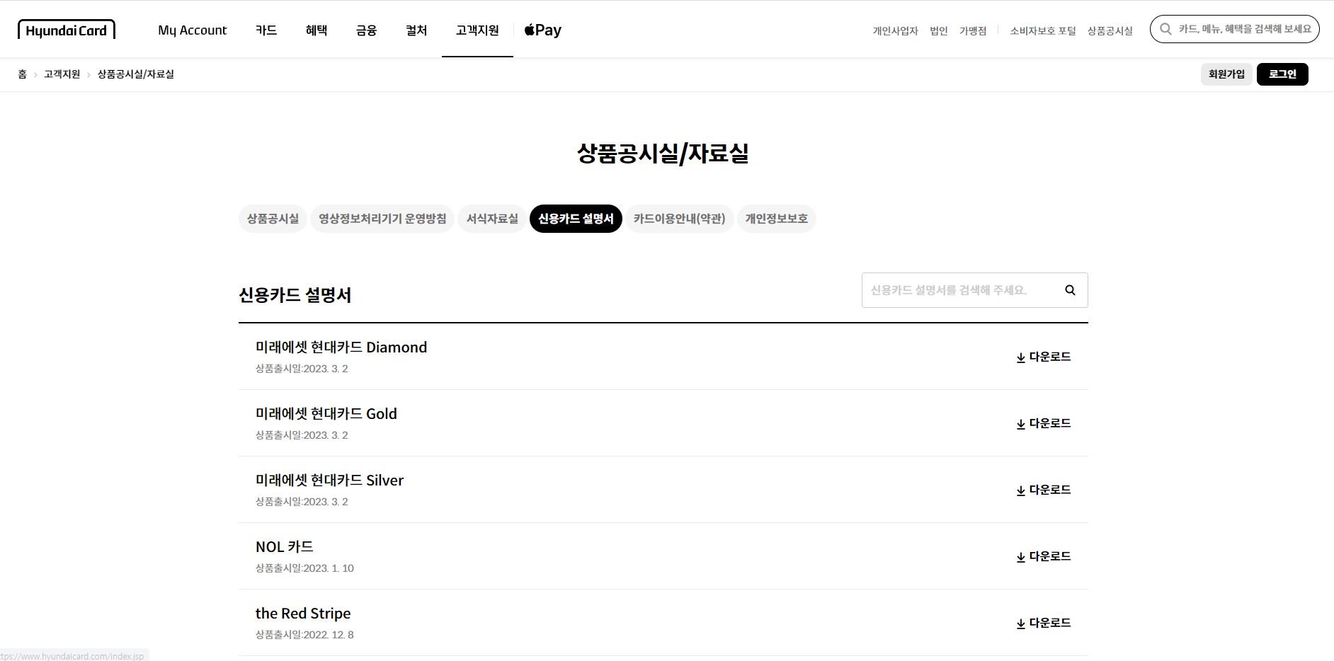 현대카드 : 홈페이지 → 고객지원 → 상품공시실/자료실 → 신용카드 설명서